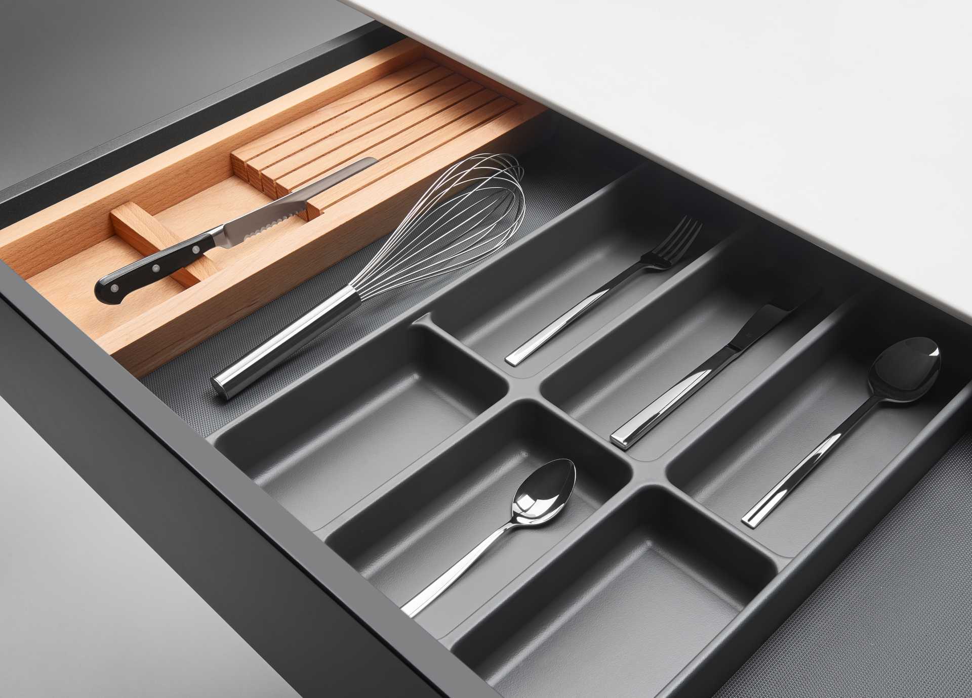 La bandeja de cubiertos multiusos MONO, cuyos bordes están cerrados por ambos lados, proporciona una solución práctica para mantener la gama habitual de cubiertos ordenados y, al mismo tiempo, crear espacio suficiente para todo tipo de utensilios. El cubertero MONO está disponible para ajustar anchos de cajón desde 400 mm.