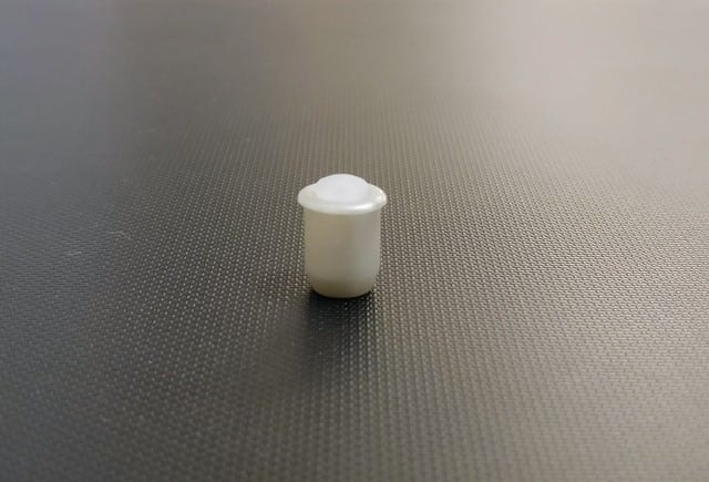 Amortiguador puerta bicomponente con una burbuja interior y un casquillo exterior con pestaña para tapar posibles imperfecciones de taladrado de la broca.