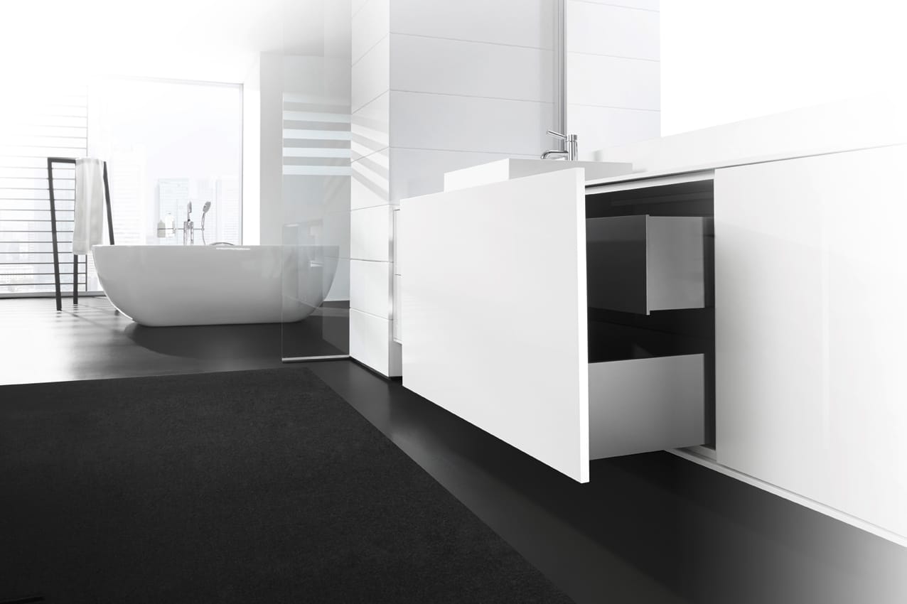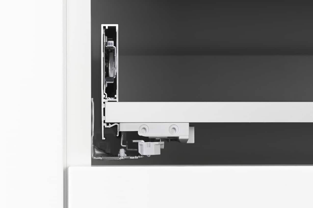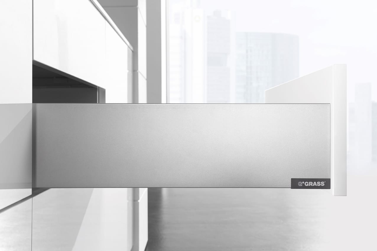 • El elegante lateral de cajón Vionaro está disponible en los colores blanco nieve, gris plata y grafito .